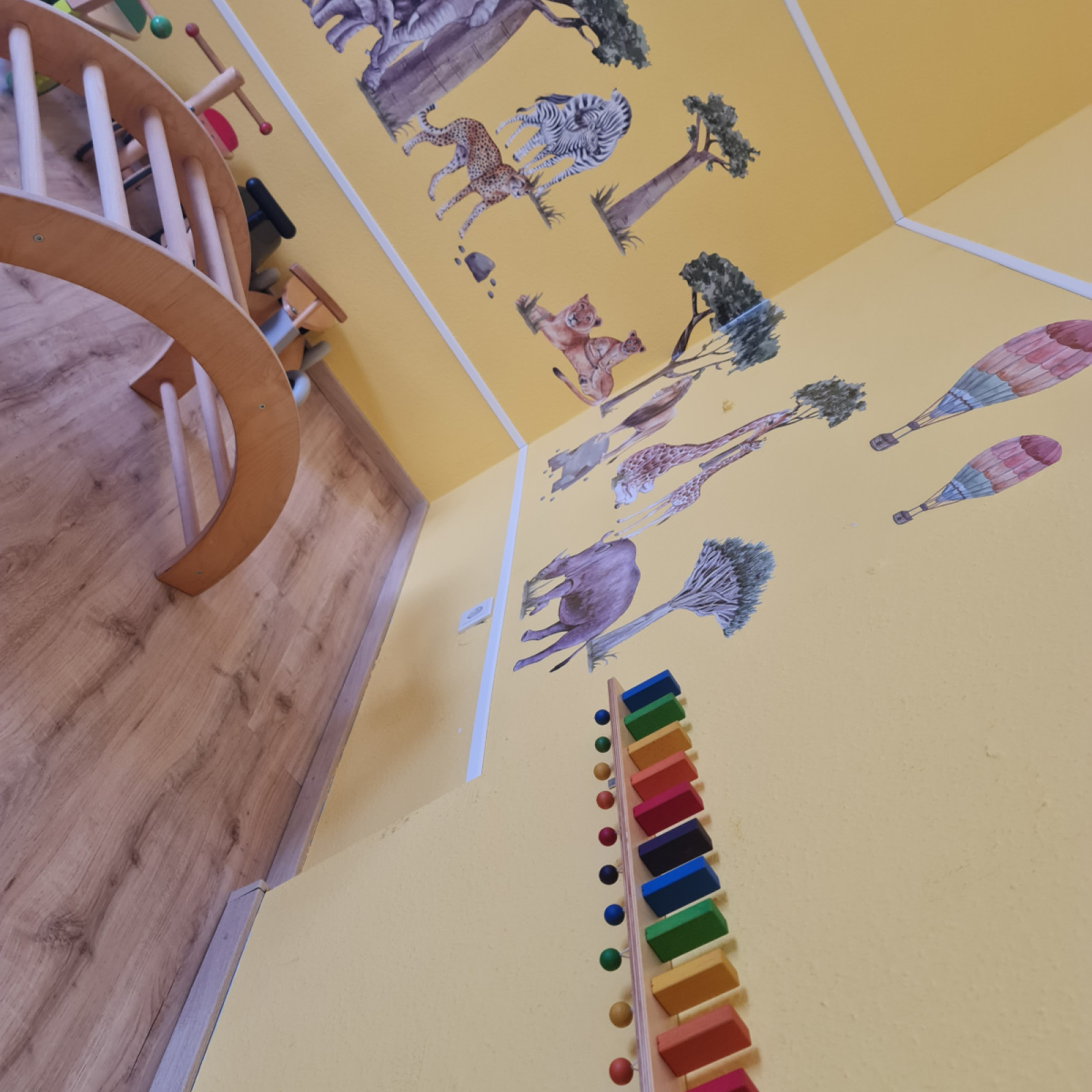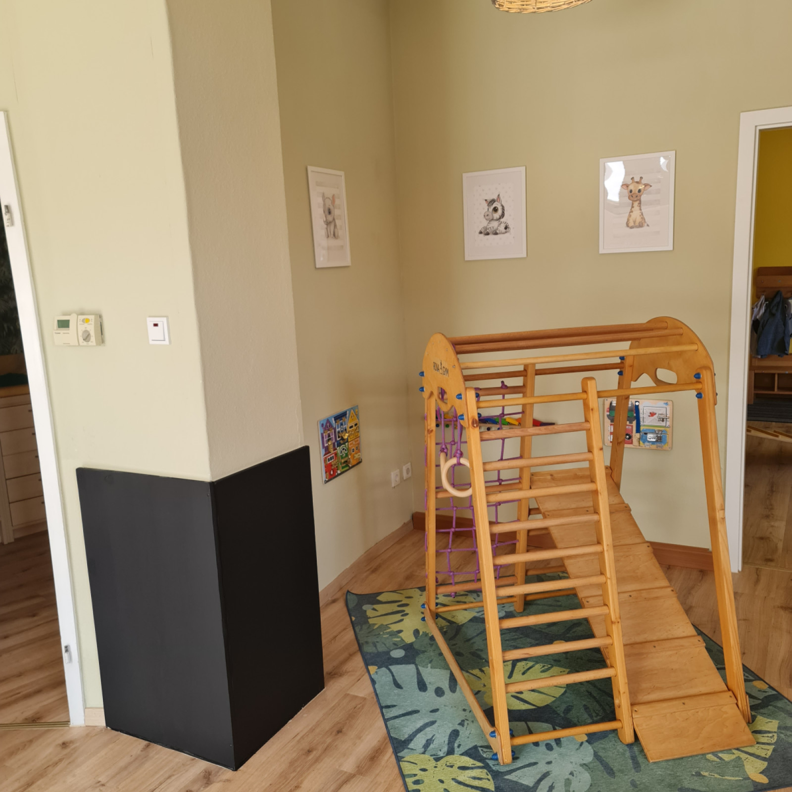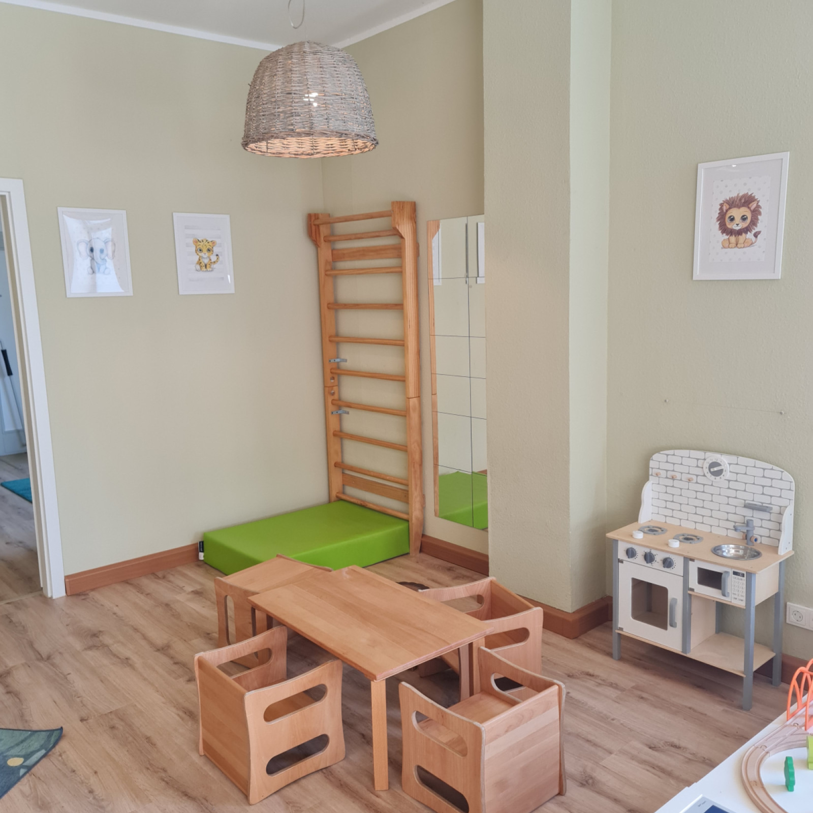 Die 4 Räume teilen sich auf in Eingangsbereich mit Kindergaderobe, Elternsitzbank, Infowand für die Eltern und verschiedene Spielmöglichkeiten, sowie Bastelschränken. Von dortaus folgt der großzügige Spiel- und Bewegungsraum mit kindgerechten Kletterturm, Kletterwand, Rutsche, Kinderküche mit kleiner Sitzgruppe, Spielecke mit Holzeisenbahn, Bücherregal mit Kuschel- und Lesesofa.