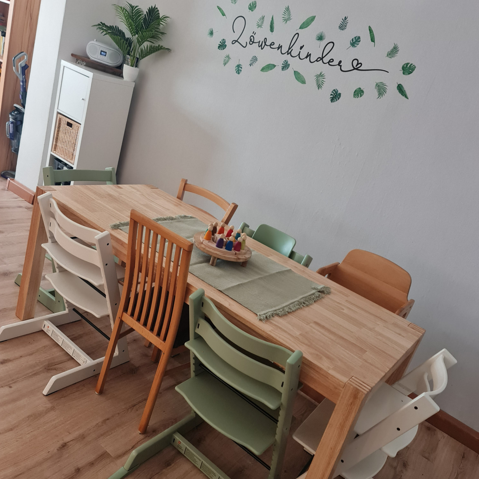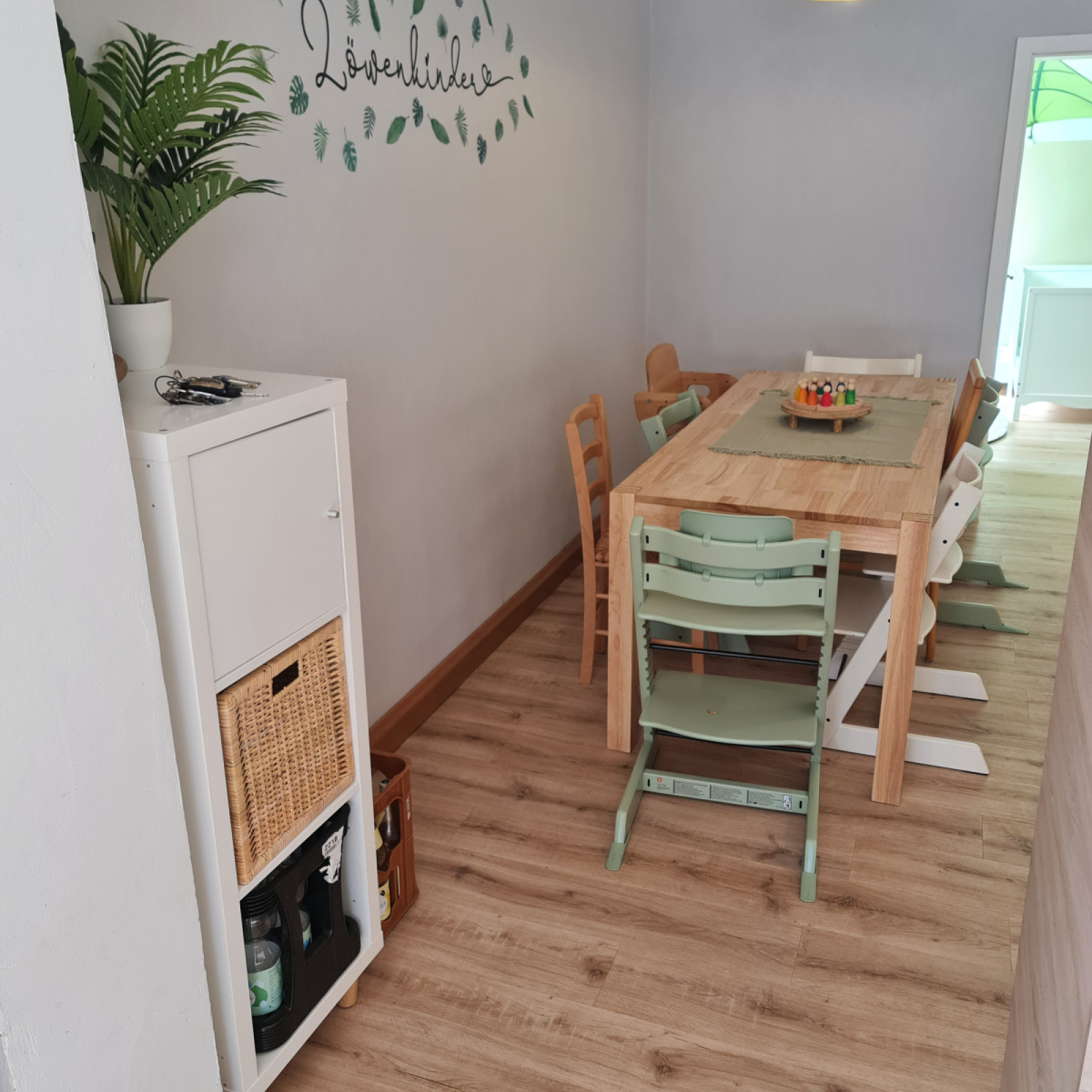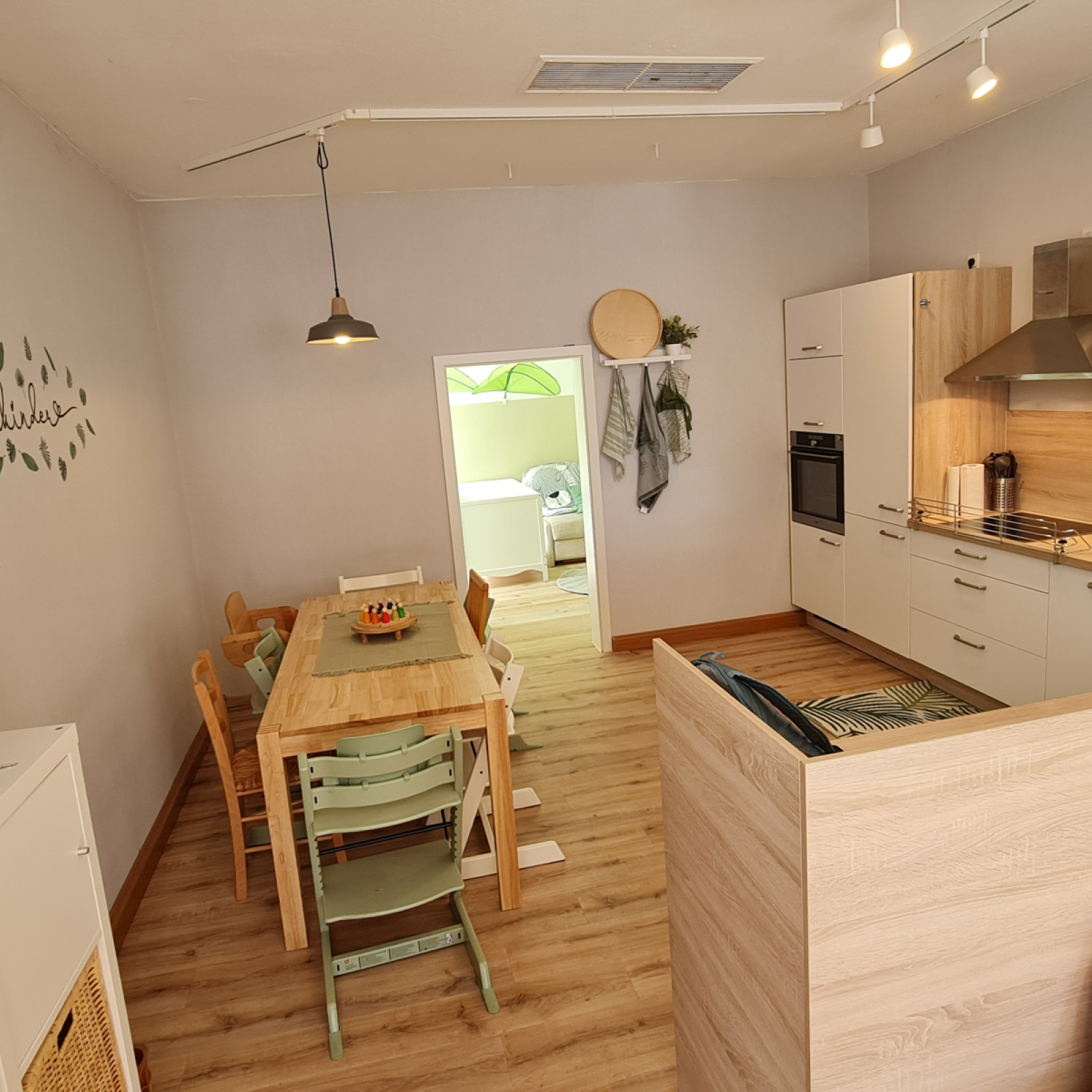 Von der offenen Küche, habe ich alle Kinder trotz Zubereitung der Mahlzeiten im Blick. Am großem Esstisch essen wir gemeinsam mit altersgerechten Hochstühlen.